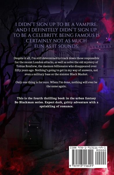 I didn't sign up to be a vampire. And I definitely didn't sign up to be a celebrity. Being famous is certainly not as much fun as it sounds. Despite it all, I'm still determined to track down those responsible for the recent London attacks, as well as solve the old mystery of Tobias Renfrew, the daemon billionaire who disappeared over fifty years ago. Nothing's going to get in my way of answers, not even a military base or the sinister Black Market. Only one thing is for sure. When I'm done, nothing will ever be the same again. This is the fourth thrilling book in the urban fantasy Bo Blackman series. Expect dark, gritty adventure with a sprinkling of romance. Book One - Dire Straits Book Two - New Order Book Three - High Stakes Book Four - Red Angel Book Five - Vigilante Vampire Book Six - Dark Tomorrow