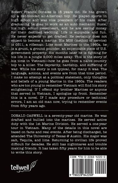 Robert Francis Donalee is 18 years old. He has grown up a red-blooded all-American boy. He played sports in high school and was vice president of his class. After graduating he goes to work as an auto mechanic. Susie, his high school sweetheart, and he are saving money for their destined wedding. Life is enjoyable and fun. He never expects to get drafted. He certainly does not expect to become a marine. His MOS (method of service) is 0311, a rifleman. Like most Marines in the 1960s, he is a grunt, a ground pounder, an expendable piece of U.S. government property. Six months later he is fighting for his life in a jungle 9,000 miles away. This is the story of his time in Vietnam-how he goes from a naive country boy to a killer. The depravity, hardship, and suffering of war. While his story is not typical, for many it was. The language, actions, and events are from that time period. I make no attempt at a political statement, only thoughts and beliefs of a young Marine in the 1960s. The readers who are too young to remember Vietnam will find his story enlightening. If I offend my brother Marines or anyone that served in Vietnam, I apologize up front. Remember this is a novel. IF I made any procedure or technical errors, I am an old man now, trying to remember events from fifty years ago.