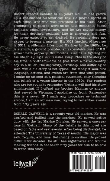 Robert Francis Donalee is 18 years old. He has grown up a red-blooded all-American boy. He played sports in high school and was vice president of his class. After graduating he goes to work as an auto mechanic. Susie, his high school sweetheart, and he are saving money for their destined wedding. Life is enjoyable and fun. He never expects to get drafted. He certainly does not expect to become a marine. His MOS (method of service) is 0311, a rifleman. Like most Marines in the 1960s, he is a grunt, a ground pounder, an expendable piece of U.S. government property. Six months later he is fighting for his life in a jungle 9,000 miles away. This is the story of his time in Vietnam-how he goes from a naive country boy to a killer. The depravity, hardship, and suffering of war. While his story is not typical, for many it was. The language, actions, and events are from that time period. I make no attempt at a political statement, only thoughts and beliefs of a young Marine in the 1960s. The readers who are too young to remember Vietnam will find his story enlightening. If I offend my brother Marines or anyone that served in Vietnam, I apologize up front. Remember this is a novel. IF I made any procedure or technical errors, I am an old man now, trying to remember events from fifty years ago.