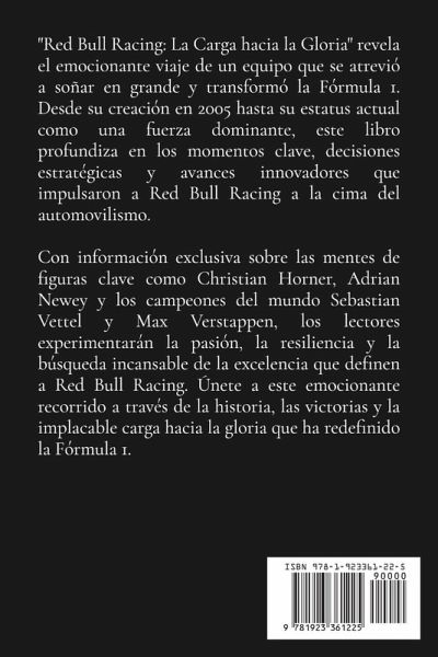 "Red Bull Racing: La Carga hacia la Gloria" revela el emocionante viaje de un equipo que se atrevió a soñar en grande y transformó la Fórmula 1. Desde su creación en 2005 hasta su estatus actual como una fuerza dominante, este libro profundiza en los momentos clave, decisiones estratégicas y avances innovadores que impulsaron a Red Bull Racing a la cima del automovilismo. Con información exclusiva sobre las mentes de figuras clave como Christian Horner, Adrian Newey y los campeones del mundo Sebastian Vettel y Max Verstappen, los lectores experimentarán la pasión, la resiliencia y la búsqueda incansable de la excelencia que definen a Red Bull Racing. Únete a este emocionante recorrido a través de la historia, las victorias y la implacable carga hacia la gloria que ha redefinido la Fórmula 1.
