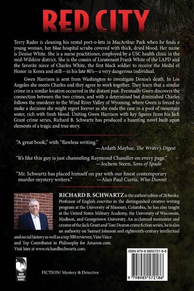Terry Rader is cleaning his rental port-o-lets in MacArthur Park when he finds a young woman, her blue hospital scrubs covered with thick, dried blood. Her name is Denise White. She is a nurse practitioner, employed by a USC health clinic in the mid-Wilshire district. She is the cousin of Lieutenant Frank White of the LAPD and the favorite niece of Charles White, the first black soldier to receive the Medal of Honor in Korea and still-in his late 80's-a very dangerous individual. Gwen Harrison is sent from Washington to investigate Denise's death. In Los Angeles she meets Charles and they agree to work together. They learn that a similar crime in a similar location occurred in the distant past. Eventually Gwen discovers the connection between the two crimes, and with a determined but diminished Charles follows the murderer to the Wind River Valley of Wyoming, where Gwen is forced to make a decision she might regret forever as she ends the case in a pool of mountain water, rich with fresh blood. Uniting Gwen Harrison with key figures from his Jack Grant crime series, Richard B. Schwartz has produced a haunting novel built upon elements of a tragic and true story.