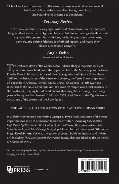 The westward drive of the warlike Sioux Indians along a thousand miles of prairie and woodland, from the upper reaches of the Mississippi to the lower Powder River in Montana, is one of the epic migrations of history. From about 1660 to the first quarter of the nineteenth century, the Teton Sioux swept away all opposition: Arikaras, Ponkas, Crees, Crows, Cheyennes--all fell away and dispersed as the Sioux advanced, until the invaders ranged over a vast territory in the northwest, hunting buffalo and raiding their neighbors. During the ensuing years of heavy conflict, between 1865 and 1877, Red Cloud of the Oglalas stood out as one of the greatest of the Sioux leaders. George E. Hyde was born in Omaha, Nebraska, in 1882. As a boy he became interested in Indians and began writing about them in 1910. He has produced some of the most important books on the American Indian ever written, including Indians of the High Plains, Indians of the Woodlands, Red Cloud's Folk, Spotted Tail's Folk, and Life of George Bent, all published by the University of Oklahoma Press. Hyde died in Omaha, Nebraska, in 1968 at the age of 86. Royal B. Hassrick was the author of serveral books on Indians and Indian art, including The Sioux: Customs of a Warrior Society, also published by the University of Oklahoma Press.