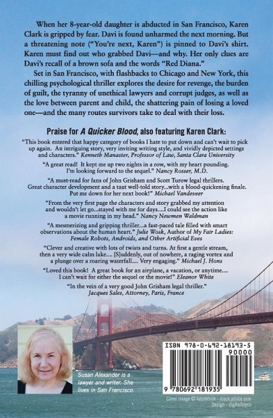 When 8-year-old Davi is abducted on Market Street in San Francisco, her mother, lawyer Karen Clark, is gripped by fear. Karen has moved to the city from Chicago hoping to make a "fresh start" after the death of her husband. The abductor, disguising his voice, calls Karen and reveals where he's left Davi. Karen and her friend Abby rush to find Davi, cruelly left alone in a barren parking lot--but unharmed. Karen's panic subsides until she finds a crude note pinned to Davi's shirt: "You're next, Karen." Haunted by the note naming her as the next victim, Karen begins working with SFPD Detective Greg Chan to discover who abducted her daughter--and why. Their only clues are Davi's recall of a brown sofa and the words "RED DIANA." Karen and Greg spend weeks trying to discover the meaning of "Red Diana." Is "Diana" the name of a street in San Francisco? Does it refer to the Roman goddess of the hunt, portrayed in famous works of art? These attempts to find the abductor lead nowhere. Karen searches her brain to think of possible abductors. Disgruntled clients in her past? Weirdos encountered since she moved to San Francisco? In a brief respite, Karen reconnects with Brad, a law-school classmate visiting San Francisco. The feelings they had for each other reawaken, and Karen goes to Brad's room at the Palace Hotel, relishing the intimate time they spend together. But the respite ends, and Karen doubts that she'll ever see Brad again. When Karen and Greg Chan reach a dead end, Karen risks her safety by going forward on her own. She's met someone who promises to lead her to the abductor. In the sumptuous Victorian home of a wealthy entrepreneur who has offered to help her, she discovers the shocking answers she's been seekig. Set in San Francisco, with flashbacks to Chicago and New York, this chilling psychological thriller explores themes like the desire for revenge, the terrible burden of guilt, the tyranny of unethical lawyers and corrupt judges, the love between parent and child, the shattering pain of losing a loved one--and the many routes survivors take to deal with their loss. Featuring a story packed with suspense, an original and compelling storyline, vivid characters, and a satisfying ending, this novel by author Susan Alexander is must-reading. Please note: Karen Clark is also the protagonist in another riveting thriller by Susan Alexander, "A Quicker Blood." The suspenseful story in "RED DIANA" takes place 12 years later.