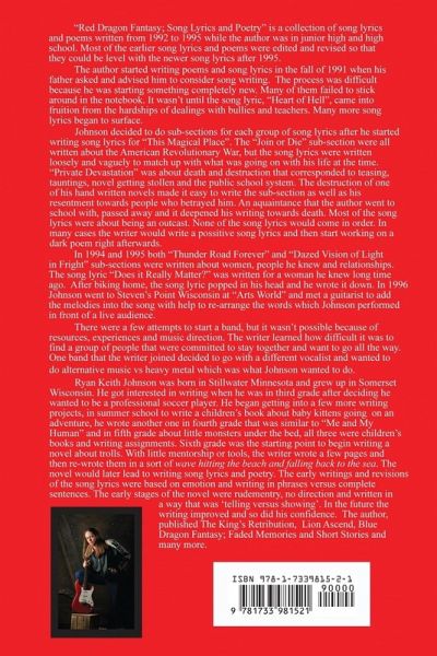 Red Dragon Fantasy; Song Lyrics and Poetry is a book of poems from 1991 to 1995. They were written during the toughest times in junior high. Song lyrics like "Heart of Hell", "Easy One" , "Trauma of Death" were just a few song lyrics to show the author's anger and pain during junior high. The song lyrics are relateable to peope who have been bullied.