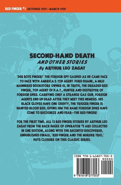 "Der Rote Finger!" the foreign spy gasped as he came face to face with America's top agent. Ford Duane, a mild mannered bookstore owner is, in truth, the dreaded Red Finger, top agent of P.A.T., hunter and destroyer of foreign spies. Carrying only a strange gas gun, foreign agents end up dead after they meet this nemesis. His black gloves have one oddity, the trigger finger is painted blood red, giving him the name foreign spies have come to recognize and fear-The Red Finger! For the first time, all 13 Red Finger stories by Arthur Leo Zagat from the back pages of Operator #5 are collected in one edition, along with the recently-discovered, unpublished finale, "Red Finger and the Murder Trio," puts closure on this classic series.
