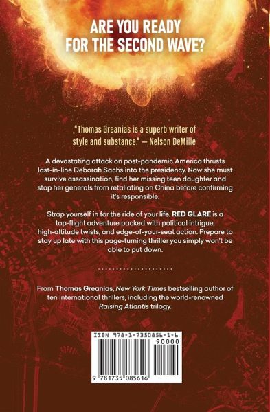 ARE YOU READY FOR THE SECOND WAVE? The king of high-octane adventure. - Brad Thor From Thomas Greanias, New York Times bestselling author of ten international thrillers, including the world-renowned Raising Atlantis trilogy. A devastating attack on America thrusts last-in-line Deborah Sachs into the presidency. Now she must survive assassination attempts, find her missing teen daughter and stop her generals from retaliating on China before confirming it's responsible. Strap yourself in for the ride of your life. Red Glare is a top-flight adventure packed with political intrigue, high-altitude twists, and edge-of-your seat action. Prepare to stay up late with this page-turning thriller you simply won't be able to put down.