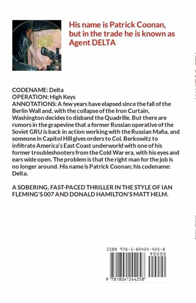 NAME: Patrick Coonan CODENAME: Delta OPERATION: High Keys ANNOTATIONS: A few years have elapsed since the fall of the Berlin Wall and, with the collapse of the Iron Curtain, Washington decides to disband the Quadrille. But there are rumors that a former Russian operative of the Soviet GRU is back in action working with the Russian Mafia, and someone in Capitol Hill gives orders to Col. Berkowitz to infiltrate America's East Coast underworld with one of his former trouble-shooters from the Cold War era, with his eyes and ears wide open. The problem is that the right man for the job is no longer around. His name is Patrick Coonan; his codename: Delta. A SOBERING, FAST-PACED THRILLER IN THE STYLE OF IAN FLEMING'S 007 AND DONALD HAMILTON'S MATT HELM.