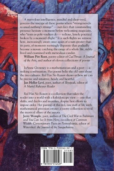 A marvelous intelligence, mindful and clear-eyed, governs the inscape of these poems where "strangeness/is so usual nothing's strange" - nor does that commanding presence hesitate a moment before welcoming magicians, who "train as pole-vaulters do - tedious, lonely practice/ broken by a moment's flight." It is such flights we witness here, increasingly aware once again of a sum greater than its parts, of moments seemingly disparate that gradually become a mosaic catching the range of a whole life, richly lived and examined with meticulous candor. William Pitt Root, poetry editor of CutThroat: A Journal of the Arts, and author of eleven collections of poems JoAnne Growney is a mathematician and a poet - a striking combination. Her poems belie the old saws about the two cultures. Red Has No Reason shows us how we can be precise and intuitive, heady and heartful. Jan Heller Levi, poet, author of Skyspeak, editor of A Muriel Rukeyser Reader Red Has No Reason is a collection that takes the reader into a world with a kaleidoscope view - one that shifts, and dazzles and mystifies, despite best efforts to impose order. Her pairing of this red, raw stuff of life with mathematical precision creates a poetry collection to rival the mystical allure of the aurora. Jerry Wemple, poet, author of The Civil War in Baltimore and You Can See It from Here, co-editor of Common Wealth: Contemporary Poets on Pennsylvania, editor of Watershed: the Journal of the Susquehanna