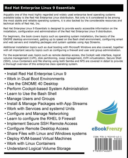 Arguably one of the most highly regarded and widely used enterprise-level operating systems available today is the Red Hat Enterprise Linux (typically shortened to RHEL and pronounced rell) distribution. Not only is it considered to be among the most stable and reliable operating systems, but it is also backed by the considerable resources and technical skills of Red Hat, Inc. Red Hat Enterprise Linux 9 Essentials is designed to provide detailed information on the installation, use, and administration of the Red Hat Enterprise Linux 9 distribution. For beginners, the book covers topics such as operating system installation, the basics of the GNOME desktop environment, configuring email and web servers, and installing packages and system updates using App Streams. Additional installation topics, such as dual booting with Microsoft Windows, are also covered, together with all important security topics, such as configuring a firewall and user and group administration. For the experienced user, topics such as remote desktop access, the Cockpit web interface, logical volume management (LVM), disk partitioning, swap management, KVM virtualization, Secure Shell (SSH), Linux Containers, and file sharing using both Samba and NFS are covered in detail to provide a thorough overview of this enterprise class operating system.