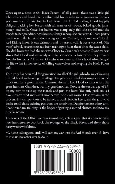 Once upon a time, in the Black Forest - of all places - there was a little girl who wore a red hood. Her mother told her to take some goodies to her sick grandmother to make her feel all better. Little red riding hood happily obliged, packing her basket with all manner of sweets, baked goods, jams, honey, and milk. Once her basket was completely full, she set off into the woods to Grandmother's house. Along the way, she met a wolf. That's pretty much where the fairytale stops being accurate. You see, her name wasn't Little Red Riding Hood, it was Crimson, and it wasn't a wolf. It was a waerwolf. She wasn't afraid, because she had been training to hunt them since she was a child. She did, however, lead the waerwolf back to Grandma's because Grandma was also a Red Hood and was ready with her crossbow in hand when they arrived. And the huntsman? That was Grandma's supporter, a black hood who pledged his life to her in the service of killing waerwolves and keeping the Black Forest safe. That story has been told for generations to all of the girls who dream of wearing the red hood and serving the village. I've probably heard that story a thousand times and for a good reason. Crimson, the first Red Hood to train under the great huntress Grandma, was my grandmother. Now, at the tender age of 17, it's my turn to take up the mantle and join the hunt. The only problem is I have already tried and failed once before. And even worse, I lost my arm in the process. The competition to be trained as a Red Hood is fierce, and the girls who desire to fill those training positions are conniving. Despite the loss of my arm, I continued my training in the hopes of getting a second chance, and now my time has come. The leaves of the Ollar Tree have turned red, a clear signal that it's time to train new huntresses to beat back the scourge of the Black Forest and show those nasty waers who's boss. My name is Sanguine, and I will earn my way into the Red Hoods, even if I have to give up my other arm to do it.