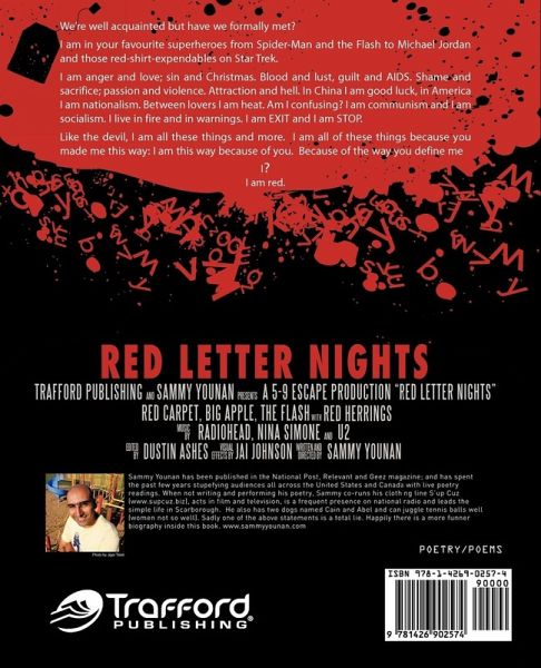 We love Red. We burden this colour with dissonant connotations, with playful and mysterious clichés. Red Letter Nights celebrates the myriad meanings of Red and all the offerings we bring to that alter. From the serious to the silly Red Letter Nights asks readers to advance from the familiar as we trip together to and through Nighttown. For there we'll find uneasy characters armed with hopeless expectations, permanent sorrow and occasionally anger. With biting distinct eloquence each of these poems has the ability to stand on its own and loudly proudly proclaim its truth. Fused they form a tapestry a relentless investigation into the prospering realms of Red. This will not be a heroic one night stand: Red Letter Nights.