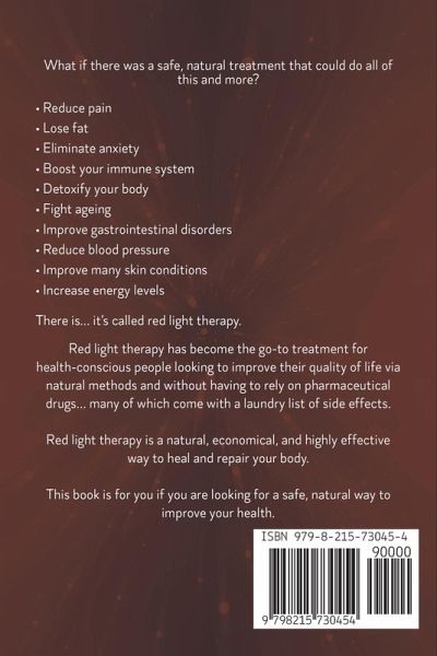 What if there was a safe, natural treatment that could do all of the following and more? - Reduce pain - Lose fat - Eliminate anxiety - Boost your immune system - Detoxify your body - Fight aging - Improve gastrointestinal disorders - Reduce blood pressure - Improve many skin conditions >There is... it's called red light therapy. Red light therapy has become the go-to treatment for health-conscious people looking to improve their quality of life via natural methods and without having to rely on pharmaceutical drugs... many of which come with a laundry list of side effects. Red light therapy is a natural, economical, and highly effective way to heal and repair your body. This book is for you if you are looking for a safe, natural way to improve your health.
