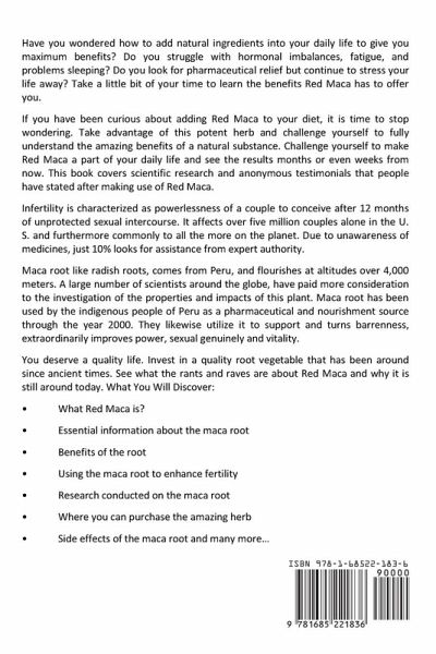 Have you wondered how to add natural ingredients into your daily life to get the maximum benefits? Do you struggle with hormonal imbalances, fatigue, and problems sleeping? Do you look for pharmaceutical relief but continue to stress your life away? Take a little bit of time to learn the benefits that red maca has to offer. If you have been curious about adding red maca to your diet, it is time to stop wondering. Take advantage of this potent herb and challenge yourself to fully understand the amazing benefits of a natural substance. Challenge yourself to make red maca a part of your daily life and see the results months or even weeks from now. This book covers scientific research and anonymous testimonials that people have provided after making use of red maca. Infertility is characterized as the powerlessness of a couple to conceive after 12 months of unprotected sexual intercourse. It affects over five million couples alone in the U. S. and furthermore commonly to all the more on the planet. Due to the lack of knowledge about medicines, only 10% look for assistance from an expert authority. Maca root like radish roots comes from Peru and flourishes at altitudes over 4,000 meters. A large number of scientists around the globe have paid more consideration to the investigation of the properties and impacts of this plant. Maca root has been used by the indigenous people of Peru as a pharmaceutical and nourishment source since the year 2000. They likewise utilize it to support and turns barrenness, extraordinarily improving power, sexual genuineness, and vitality. You deserve a quality life. Invest in a quality root vegetable that has been around since ancient times. See what the rants and raves are about Red maca and why it is still around today. What You Will Discover: · What Red Maca is? · Essential information about the maca root · Benefits of the root · Using the maca root to enhance fertility · Research conducted on the maca root · Where you can purchase the amazing herb · Side effects of the maca root and many more...