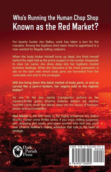 Who's Running the Human Chop Shop Known as Red Market? For bounty hunter Jinx Ballou, work has taken a turn for the macabre. Among the fugitives she's been hired to apprehend is a man wanted for illegally selling cadavers. When the body broker himself turns up dead, Jinx finds herself behind the eight ball as the prime suspect in his murder. Desperate to clear her name, Jinx dives deep into her fugitive's morbid business dealings. What she discovers is far more gruesome-a site on the dark web where body parts are harvested from the vulnerable and sold to the privileged. Will Jinx bring down this black market of body parts, or end up carved like a jack-o'-lantern, her organs sold to the highest bidder? ¿¿As one of the few openly transgender authors in the mystery/thriller genre, Dharma Kelleher delivers yet another heartfelt crime novel that delves deep into the issues of freedom, power, and accountability. Red Market is the fifth book in the highly acclaimed Jinx Ballou Bounty Hunter crime thriller series. If you enjoy heart-pounding suspense, page-turning plot twists, and queer women who kick ass, you'll love Dharma Kelleher's chilling adventure that cuts to the heart of privilege. Curl up with Red Market and join Jinx on an action-packed thrill ride that will leave you cheering for more.
