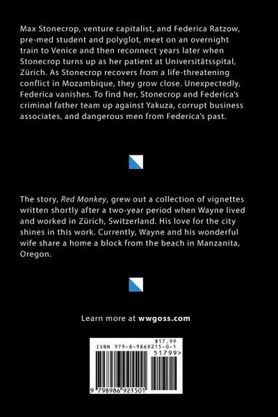 Max Stonecrop, venture capitalist, and Federica Ratzow, pre-med student and polyglot, meet on an overnight train to Venice and then re-connect seven years later when Stonecrop turns up as her patient at Universitätsspital, Zürich. As Stonecrop recovers from a climbing accident and a violent, traumatic experience in Mozambique, they grow close. Federica suddenly vanishes, prompting Stonecrop and Federica's criminal father to team up against Yakuza gangsters, corrupt business associates, and dangerous men from Federica's past.