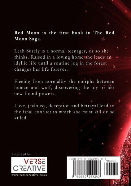 Red moon is the first book in The Red Moon Saga. Leah Surely is a normal teenager, or so she thinks. Raised in a loving home she leads an idyllic lifestyle until a routine jog in the forest changes her life forever. Fleeing from normality she morphs between human and wolf, discovering the joy of her powers. Love, jealousy and betrayal lead to the final conflict...