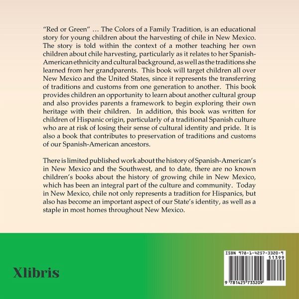 "Red or Green" ... The Colors of a Family Tradition, is an educational story for young children about the harvesting of chile in New Mexico. The story is told within the context of a mother teaching her own children about chile harvesting, particularly as it relates to her Spanish-American ethnicity and cultural background, as well as the traditions she learned from her grandparents. This book will target children all over New Mexico and the United States, since it represents the transferring of traditions and customs from one generation to another. This book provides children an opportunity to learn about another cultural group and also provides parents a framework to begin exploring their own heritage with their children. In addition, this book was written for children of Hispanic origin, particularly of a traditional Spanish culture who are at risk of losing their sense of cultural identity and pride. It is also a book that contributes to preservation of traditions and customs of our Spanish-American ancestors. There is limited published work about the history of Spanish-American's in New Mexico and the Southwest, and to date, there are no known children's books about the history of growing chile in New Mexico, which has been an integral part of the culture and community. Today in New Mexico, chile not only represents a tradition for Hispanics, but also has become an important aspect of our State's identity, as well as a staple in most homes throughout New Mexico.
