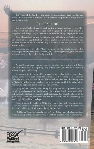 The ‘Code of the Cowboy’ and ranch life is generations deep in ethics and mores. The ranch families of today are torn between the past and a future they are unable to dissuade. Red Pasture is the first book in the High Riding Heart series. The 89, 573 word contemporary western romance novel holding adventure and excitement on every page. The influence of favored authors Janette Oak and Louis L’Amour, combined with the personal experiences of the series author Kathryn Bartow have borne the Moore Ranch family saga. When you have loved one man your entire life and suddenly your life is shattered; how do you find the courage to live on without that love? Faith in family and God.