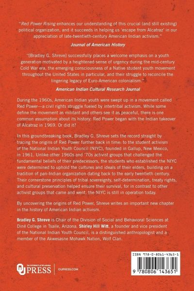 2012 New Mexico/Arizona Book Awards-Multicultural (finalist) Uncovers the origins of the Red Power movement During the 1960s, American Indian youth were swept up in a movement called Red Power-a civil rights struggle fueled by intertribal activism. While some define the movement as militant and others see it as peaceful, there is one common assumption about its history: Red Power began with the Indian takeover of Alcatraz in 1969. Or did it? In this groundbreaking book, Bradley G. Shreve sets the record straight by tracing the origins of Red Power further back in time: to the student activism of the National Indian Youth Council (NIYC), founded in Gallup, New Mexico, in 1961. Unlike other 1960s and '70s activist groups that challenged the fundamental beliefs of their predecessors, the students who established the NIYC were determined to uphold the cultures and ideals of their elders, building on a tradition of pan-Indian organization dating back to the early twentieth century. Their cornerstone principles of tribal sovereignty, self determination, treaty rights, and cultural preservation helped ensure their survival, for in contrast to other activist groups that came and went, the NIYC is still in operation today. But Shreve also shows that the NIYC was very much a product of 1960s idealistic ferment and its leaders learned tactics from other contemporary leftist movements. By uncovering the origins of Red Power, Shreve writes an important new chapter in the history of American Indian activism. And by revealing the ideology and accomplishments of the NIYC, he ties the Red Power Movement to the larger struggle for human rights that continues to this day both in the United States and across the globe. Bradley G. Shreve is Chair of the Division of Social and Behavioral Sciences at Diné College in Tsaile, Arizona. Shirley Hill Witt was a founder and vice president of the National Indian Youth Council. A distinguished anthropologist and former foreign service officer, she is a member of the Akwesasne Mohawk Nation, Wolf Clan.
