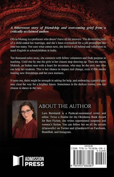 A bittersweet story of friendship and overcoming grief from a critically acclaimed author. Olivia Montag is a professor who doesn't have all the answers. The devastating loss of a child ended her marriage, and she's been overlooked for a job promotion one time too many. Not sure what comes next, she leaves it all behind and volunteers to teach English to schoolchildren in India. Ten thousand miles away, she connects with fellow volunteers and finds purpose in teaching. Until one by one the girls in her classes stop showing up. Then she meets Mukesh, an Indian man with a heart for invention, who may be the only one who can help her students. This is her chance to impact real change, even if that means trusting new friendships and her own instincts. It turns out, there might be strength in asking for help, and embracing a painful past may clear the way for a brighter future. Sometimes in the darkest storms, you can choose to dance in the rain. Eat, Pray, Love meets Best Exotic Marigold Hotel in this poignant but uplifting story of finding your purpose.