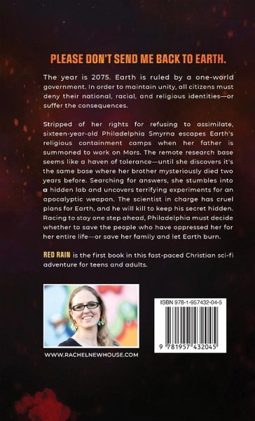 Please don't send me back to Earth. The year is 2075. Earth is ruled by a one-world government. In order to maintain unity, all citizens must deny their national, racial, and religious identities-or suffer the consequences. Stripped of her rights for refusing to assimilate, sixteen-year-old Philadelphia Smyrna escapes Earth's religious containment camps when her father is summoned to work on Mars. The remote research base seems like a haven of tolerance-until she discovers it's the same base where her brother mysteriously died two years before. Searching for answers, she stumbles into a hidden lab and uncovers terrifying experiments for an apocalyptic weapon. The scientist in charge has cruel plans for Earth, and he will kill to keep his secret hidden. Racing to stay one step ahead, Philadelphia must decide whether to save the people who have oppressed her for her entire life-or save her family and let Earth burn. Red Rain is the first book in this fast-paced Christian sci-fi adventure for teens and adults.