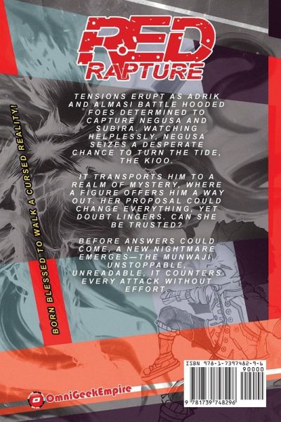 In this fully illustrated YA supernatural shonen fantasy manga, a devout boy blessed with god-like powers becomes the hunted. Now his purpose is to uncover the truth behind the "Great Light" and find meaning to his cursed reality! This volume collects the explosive continuation of Red Rapture, featuring the second half of Issue 5 and the full arcs of Issues 6 and 7. Adrik and Almasi continue their clash with the group of hooded assailants hellbent on capturing Negusa and Subira. As the battle rages on, it's becoming abundantly clear that the Medjay are losing. With everything at stake and the grief of his late grandmother in his heart, Negusa takes a leap of faith and decides that he no longer wants to stand around as people are in danger. Formulating a risky plan to obtain the Kioo left behind by one of the deceased hooded attackers, Negusa hopes that with the added power, he could be of help. However, what transpired next was beyond what Negusa had expected. Instead of power, he comes face to face with a mysterious girl named Anya, who offers him a deal. But trust is dangerous. Is she a savior... can she be trusted? Does Negusa even have a choice? As if things couldn't get worse, the Munwaji appears. A cold, invincible, and unfathomable monster who even the Medjays are terrified of makes his presence known. Worst yet, the creature seems to have its eyes set on only Negusa. With every blow failing and every plan breaking, the odds are dangerously stacked against the young boy.