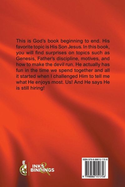 This is God's book beginning to end. His favorite topic is His Son Jesus. In this book, you will find surprises on topics such as Genesis, Father's discipline, motives, and how to make the devil run. He actually has fun in the time we spend together and all it started when I challenged Him to tell me what He enjoys most. Us! And He says He is still hiring!