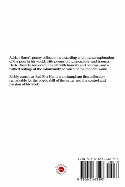 Adrian Harte's poetry collection is a startling and intense exploration of the poet in his world, with poems of humour, love, violence, trauma. Harte dissects and examines life with honesty and courage and a baffled outrage at the inhumanity of much of the modern world. Richly evocative, Red Rite Hand is a triumphant first collection, remarkable for the poetic skill of the writer and the control and passion of his work.
