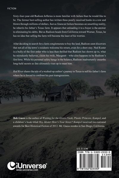 Sixty-four-year-old Radison Jefferies is more familiar with failure than he would like to be. The former best-selling author has written three poorly received books in a row and blown through millions of dollars. Just as financial failure becomes an unsettling reality, he inherits his father's Texas farm. It appears that unloading it to a buyer is the answer to eliminating his debts. But as Radison heads from California toward Warner, Texas, he has no idea that selling the farm will become the least of his worries. After deciding to search for a farm conglomerate to buy the land, Radison soon discovers that not all of the town's residents welcome his return, even for a short stay. Ned Kuster is a bully of the first order who is less than thrilled that Radison has shown up to, what he mistakenly believes, claim his wife, Margaret-who also happens to be Radison's first love. While his personal safety hangs in the balance, Radison inadvertently unearths long-held secrets as fate ultimately rises up to meet him. Red River shares the tale of a washed-up author's journey to Texas to sell his father's farm where he is forced to confront his past transgressions.