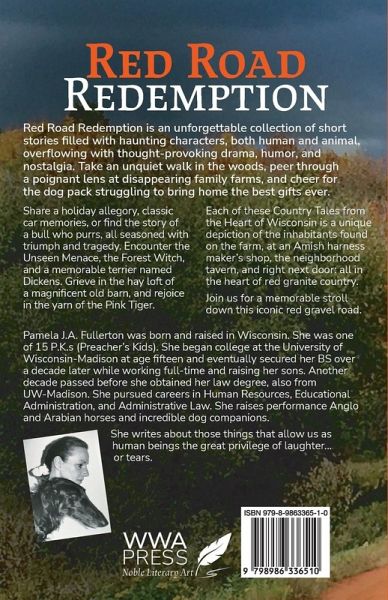 Short Story Collection Red Road Redemption is an unforgettable collection of short stories filled with haunting characters, both human and animal, overflowing with thought-provoking drama, humor, and nostalgia. Take an unquiet walk in the woods, peer through a poignant lens at disappearing family farms, and cheer for the dog pack struggling to bring home the best gifts ever. Find a holiday allegory to share, classic car memories, and the story of a bull who purrs, all seasoned with triumph and tragedy. Encounter the Unseen Menace, the Old Grey Mare, and a distinctive terrier named Dickens. Meet the Forest Witch, grieve in the hay loft of a magnificent barn, and rejoice in the yarn of the Pink Tiger. Each of these 'Country Tales from the Heart of Wisconsin' is a unique depiction of the varied inhabitants found at the farm, an Amish harness maker's shop, the neighborhood tavern, and right next door: all in the heart of red granite country. Join us for a memorable stroll down that iconic red gravel road.