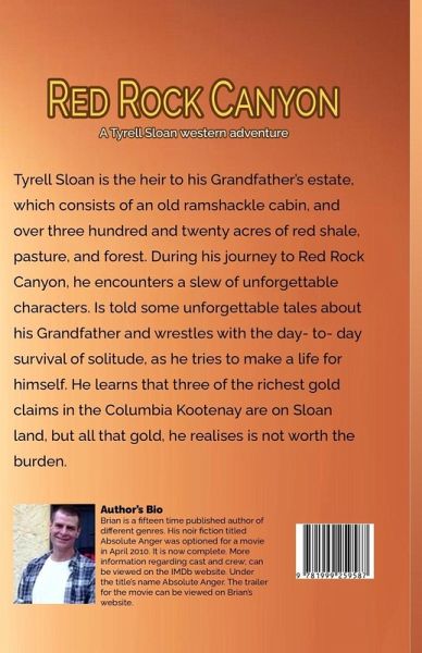 Tyrell Sloan is the heir to his Grandfather's estate, which consists of an old ramshackle cabin, and over three hundred and twenty acres of red shale, pasture, and forest. During his journey to Red Rock Canyon, he encounters a slew of unforgettable characters. Is told some unforgettable tales about his Grandfather and wrestles with the day to day survival of solitude, as he tries to make a life for himself. He learns that three of the richest gold claims in the Columbia Kootenay are on Sloan land, but all that gold he realises isn't worth the burden.