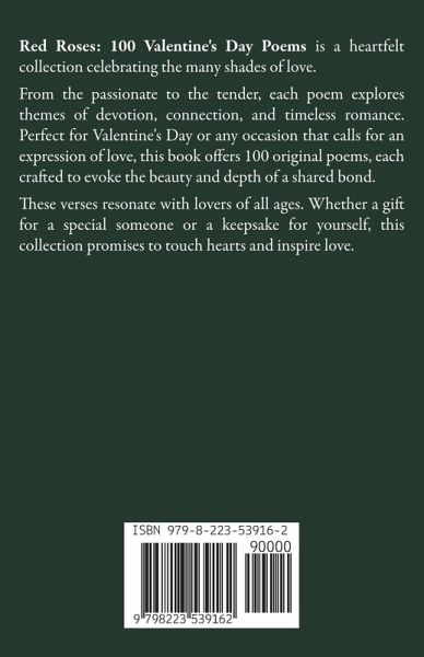 Red Roses: 100 Valentine's Day Poems is a heartfelt collection celebrating the many shades of love. From the passionate to the tender, each poem explores themes of devotion, connection, and timeless romance. Perfect for Valentine's Day or any occasion that calls for an expression of love, this book offers 100 original poems, each crafted to evoke the beauty and depth of a shared bond. These verses resonate with lovers of all ages. Whether a gift for a special someone or a keepsake for yourself, this collection promises to touch hearts and inspire love.