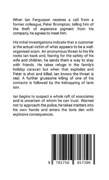 When Ian Fergusson receives a call from a former colleague, Peter Brompton, telling him of the theft of expensive pigment from his company, he agrees to meet him. His initial investigations indicate that another company is the actual victim of what appears to be a well-organised scam. An anonymous threat to his life rocks Ian back and, fearing for his life and the safety of his wife and children, he sends them away to stay with friends. He takes refuge in the family's holiday caravan but when that explodes and Peter is shot and killed, Ian knows the threats are real. A further gruesome killing of one of his contacts is followed by the kidnapping of Ian's son. Ian begins to suspect the involvement of a whole raft of his associates and is uncertain whom he can trust. Warned not to approach the police if he wants to see his son again, Ian takes matters into his own hands. Believing he has identified the gang leader, he boldly, if rather foolishly, enters the lion's den with explosive consequences.