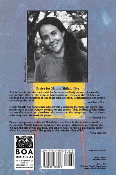 Naomi Shihab Nye, poet, essayist, anthologist, has been a recipient of writing fellowships from the Lannan Foundation, the Guggenheim Foundation and the Witter Bynner Foundation/Library of Congress. Author of more than twenty volumes, her recent books include Mint Snowball and 19 Varieties of Gazelle: Poems of the Middle East which was selected as a National Book Award finalist in 2002. Her books of poems include Fuel (BOA Editions) and Red Suitcase (BOA). Nye's work has been featured on the PBS poetry specials NOW with Bill Moyers , The Language of Life with Bill Moyers and The United States of Poetry . She has read her work on National Public Radio's Prairie Home Companion. Poetry editor for The Texas Observer, Nye has worked for as a visiting writer in schools at all educational levels. She lives in San Antonio, Texas.