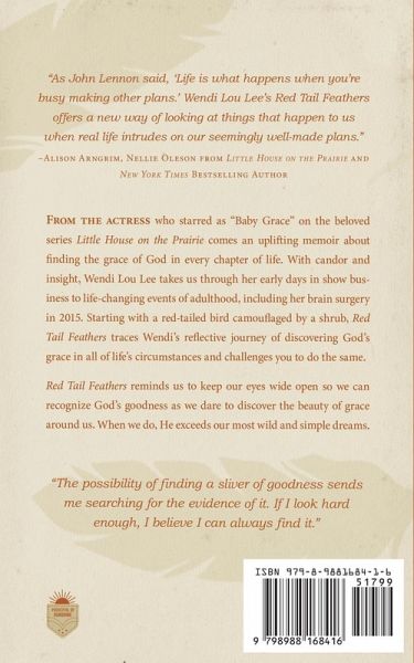 From the actress who starred as "Baby Grace" on the beloved series Little House on the Prairie comes an uplifting memoir about finding the grace of God in every chapter of life. With candor and insight, Wendi Lou Lee takes us through her early days in show business to life-changing events of adulthood, including her brain surgery in 2015. Starting with a red-tailed bird camouflaged by a shrub, Red Tail Feathers traces Wendi's reflective journey of discovering God's grace in all of life's circumstances and challenges you to do the same. Red Tail Feathers reminds us to keep our eyes wide open so we can recognize God's goodness as we dare to discover the beauty of grace around us. When we do, He exceeds our most wild and simple dreams. "The possibility of finding a sliver of goodness sends me searching for the evidence of it. If I look hard enough, I believe I can always find it."