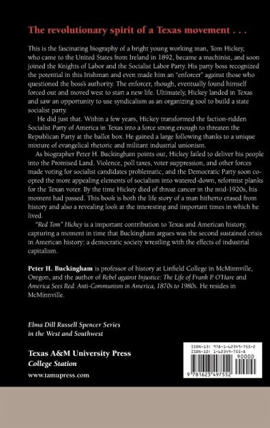 This is the fascinating biography of a bright young working man, Tom Hickey, who came to the United States from Ireland in 1892, became a machinist, and soon joined the Knights of Labor and the Socialist Labor Party. His party boss recognized the potential in this Irishman and even made him an "enforcer" against those who questioned the boss’s authority. The enforcer, though, eventually found himself forced out and moved west to start a new life. Ultimately, Hickey landed in Texas and saw an opportunity to use syndicalism as an organizing tool to build a state socialist party. He did just that. Within a few years, Hickey transformed the faction-ridden Socialist Party of America in Texas into a force strong enough to threaten the Republican Party at the ballot box. He gained a large following thanks to a unique mixture of evangelical rhetoric and militant industrial unionism. As biographer Peter H. Buckingham points out, Hickey failed to deliver his people into the Promised Land. Violence, poll taxes, voter suppression, and other forces made voting for socialist candidates problematic, and the Democratic Party soon co-opted the more appealing elements of socialism into watered-down, reformist planks for the Texan voter. By the time Hickey died of throat cancer in the mid-1920s, his moment had passed. "Red Tom" Hickey is an important contribution to Texas and American history, capturing a moment in time that Buckingham argues was the second sustained crisis in American history: a democratic society wrestling with the effects of industrial capitalism.