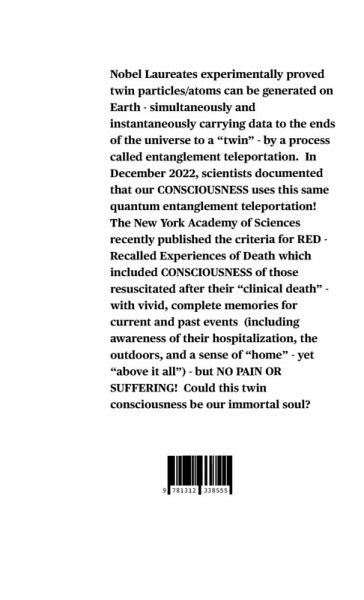Nobel Laureates experimentally proved twin particles/atoms can be generated on Earth - simultaneously and instantaneously carrying data to the ends of the universe to a "twin" - by a process called entanglement teleportation. In December 2022, scientists documented that our CONSCIOUSNESS uses this same quantum entanglement teleportation! The New York Academy of Sciences recently published the criteria for RED - Recalled Experiences of Death which included CONSCIOUSNESS of those resuscitated after their "clinical death" - with vivid, complete memories for current and past events (including awareness of their hospitalization, the outdoors, and a sense of "home" - yet "above it all") - but NO PAIN OR SUFFERING! Could this twin consciousness be our immortal soul?