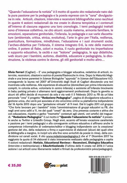 "Quando l'educazione fa notizia" è il motto di questo sito redazionale nato dalla pura passione per la pedagogia e la poesia espresse con la "sana" divulgazione in rete. Articoli, citazioni, interviste e recensioni bibliografiche sono racchiusi in queste 4 sezioni redazionali da me create in diversa tempistica e i contenuti all'interno di ciascuna seguono una loro cronologia. I temi pedagogici trattati sono d'interesse collettivo, ne cito alcuni: scuola materna, armonia familiare, le emozioni, separazione genitoriale, l'infanzia, la pedagogia e sue varie sfaccettature (ambientale, critica, etnica, evolutiva), l'arte in giro per l'Italia, resilienza, puericultura, formazione, mindfulness, l'educazione e i suoi strumenti social, l'archeo-didattica per l'infanzia, il sistema integrato 0-6, la rete delle mamme online, il potere di fiabe, colori e musica, il ruolo genitoriale tra imperfezione e supporto educativo, la cecità e sua "lezione" pedagogica, le app didattiche, web sicuro per i bambini, autismo, disabilità, educatore e pedagogista, la disostruzione, la violenza contro le donne, gli stili genitoriali e molto altro...