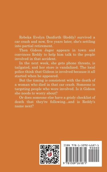 Rebeka Evelyn Danforth (Reddy) survived a car crash and now, five years later, she's settling into partial retirement. Then Gideon Jager appears in town and convinces Reddy to help him talk to the people involved in that accident. In the next week, she gets phone threats, is tailgated, and her store is vandalized. The local police think that Gideon is involved because it all started when he appeared. But the timing is consistent with the death of a woman who died in that car crash. Someone is targeting people who were involved. Is it Gideon she needs to worry about? Or does someone else have a grisly checklist of death that they're following...and is Reddy's name next?