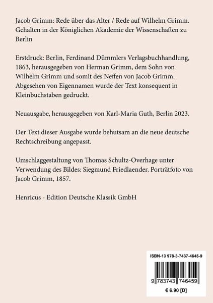 Jacob Grimm: Rede über das Alter / Rede auf Wilhelm Grimm. Gehalten in der Königlichen Akademie der Wissenschaften zu BerlinErstdruck: Berlin, Ferdinand Dümmlers Verlagsbuchhandlung, 1863, herausgegeben von Herman Grimm, dem Sohn von Wilhelm Grimm und somit des Neffen von Jacob Grimm. Abgesehen von Eigennamen wurde der Text konsequent in Kleinbuchstaben gedruckt.Neuausgabe, herausgegeben von Karl-Maria Guth, Berlin 2023.Der Text dieser Ausgabe wurde behutsam an die neue deutsche Rechtschreibung angepasst.Umschlagabbildung: Siegmund Friedlaender, Porträtfoto von Jacob Grimm, 1857Gesetzt aus der Minion Pro, 11 pt.Die Sammlung Hofenberg erscheint im Verlag Henricus - Edition Deutsche Klassik GmbH, Berlin