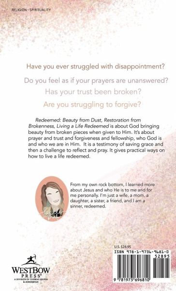 Have you ever struggled with disappointment? Do you feel as if your prayers are unanswered? Has your trust been broken? Are you struggling to forgive? Are you facing battles in your life? Redeemed: Beauty From Dust, Restoration From Brokenness, Living a Life Redeemed is about God bringing beauty from broken pieces when given to Him. It's about prayer and trust and forgiveness and fellowship. His victory over sin in my life, and what I learned from my rock bottom. Wherever you are in life or your walk with God, my prayer is that you will find Jesus here, in the midst of heartache and reconciliation. It's about who God is and who we are in Him, a God who cares and works all things together for our good. It is a testimony of saving grace and a challenge to reflect and pray. By talking about living in the now and for an audience of one, it gives practical ways on how to live a life reflecting a heart redeemed.