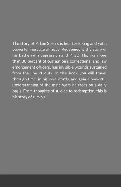 The story of P. Lee Spears is heartbreaking and yet a powerful message of hope. Redeemed is the story of his battle with depression and PTSD. He, like more than 30 percent of our nation's correctional and law enforcement officers, has invisible wounds sustained from the line of duty. In this book you will travel through time, in his own words, and gain a powerful understanding of the mind wars he faces on a daily basis. From thoughts of suicide to redemption, this is his story of survival!