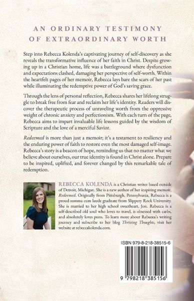 AN ORDINARY TESTIMONY OF EXTRAORDINARY WORTH Step into Rebecca Kolenda's captivating journey of self-discovery as she reveals the transformative influence of her faith in Christ. Despite growing up in a Christian home, life was a battleground where dysfunction and expectations clashed, damaging her perspective of self-worth. Within the heartfelt pages of her memoir, Rebecca lays bare the scars of her past while illuminating the redemptive power of God's saving grace. Through the lens of personal reflection, Rebecca shares her lifelong struggle to break free from fear and reclaim her life's identity. Readers will discover the therapeutic process of unraveling worth from the oppressive weight of chronic anxiety and perfectionism. With each turn of the page, Rebecca aims to impart invaluable life lessons guided by the wisdom of Scripture and the love of a merciful Savior. Redeemed is more than just a memoir; it's a testament to resiliency and the enduring power of faith to restore even the most damaged self-image. Rebecca's story is a beacon of hope, reminding us that no matter what we believe about ourselves, our true identity is found in Christ alone. Prepare to be inspired, uplifted, and forever changed by this remarkable tale of redemption.
