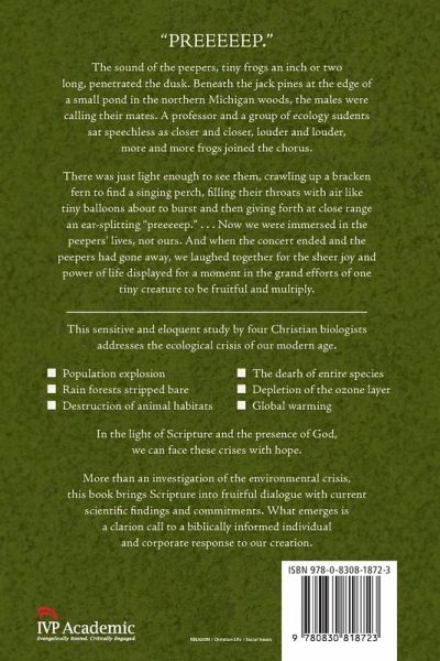 "Preeeeep." The sound of the peepers, tiny frogs an inch or two long, penetrated the dusk. Beneath the jack pines at the edge of a small pond in the northern Michigan woods, the males were calling their mates. A professor and a group of ecology students sat speechless as closer and closer, louder and louder, more and more peepers joined in chorus. There was just light enough to see them, crawling up a bracken fern to find a singing perch, filling their throats with air like tiny balloons about to burst and then giving forth at close range an ear-splitting 'preeeeep.; . . . Now we were immersed in the peepers' lives, not ours. And when the concert ended and the peepers had gone away, we laughed together for the sheer joy and power of life displayed for a moment in the grand efforts of one tiny creature to be fruitful and multiply." Combining compelling stories with both biblical and scientific investigation, Redeeming Creation addresses the ecological crisis we face today.population explosion rain forests stripped bare destruction of animal habitat the death of entire species depletion of the ozone layer global warming The authors, four biologists and teachers, believe that we can face these dilemmas with hope. Moving beyond a mere survey of the planet's ills, they bring Scripture into fruitful dialogue with current scientific findings and commitments. They both inspire and inform our individual and corporate response to God's creation.