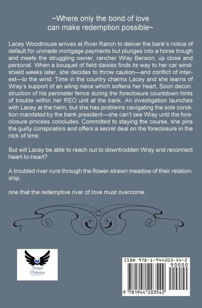 ~Where only the bond of love can make redemption possible~ Lacey Woodhouse arrives at River Ranch to deliver the bank's notice of default for unmade mortgage payments but plunges into a horse trough and meets the struggling owner, rancher Wray Benson, up close and personal. When a bouquet of field daisies finds its way to her car windshield weeks later, she decides to throw caution-and conflict of interest-to the wind. Time in the country charms Lacey and she learns of Wray's support of an ailing family member which softens her heart. Soon destruction of his perimeter fence during the foreclosure countdown hints of trouble within her REO unit at the bank. An investigation launches with Lacey at the helm, but she has problems navigating the sole condition mandated by the bank president-she can't see Wray until the foreclosure process concludes. As the dreaded foreclosure clock ticks down, will Lacey be able to reach out to downtrodden Wray and reconnect heart-to-heart? A troubled undercurrent runs through the flower-strewn meadow of their relationship, one that the redemptive river of love must overcome.