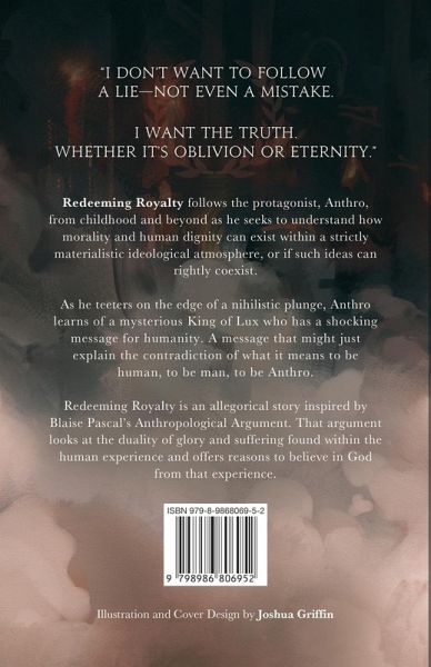 Redeeming Royalty follows the protagonist, Anthro, from childhood and beyond as he seeks to understand how morality and human dignity can exist within a strictly materialistic ideological atmosphere, or if such ideas can rightly coexist. As he teeters on the edge of a nihilistic plunge, Anthro learns of a mysterious King of Lux who has a shocking message for humanity. A message that might just explain the contradiction of what it means to be human, to be man, to be Anthro. Redeeming Royalty is an allegorical story inspired by Blaise Pascal's Anthropological Argument. That argument looks at the duality of glory and suffering found within the human experience and offers reasons to believe in God from that experience.