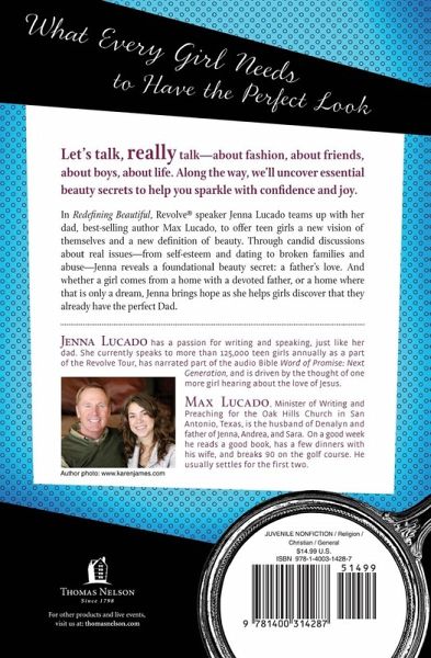 Not feeling very beautiful? Learn what beauty is from God's perspective. Revolve speaker Jenna Lucado has teamed up with her dad, Max Lucado, to bring girls a fresh perspective on what they need to live a life of peace, joy, and confidence. What does God see when He looks at them? And how does a girl catch that vision? Jennareveals life accessories that are essential, and which single accessoryis a real must-have to give teens a look they love--a look that saysthey are comfortable with who they are and secure and confident. What'sthe all-important accessory? Love from a father. But what happens whenthere is no loving father in sight, no daddy to tell them they arebeautiful? Through conversational "girl time" Jenna reveals that when we look to God as our Father, He can change our focus, our look, and our lives. With affirmation from Max, Redefining Beautiful will change the way girls look at God, themselves, and the people around them.