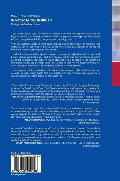 The book "Redefining German Health Care" by Michael Porter and Clemens Guth provides a fact-based analysis of the development of the German health care system. On the one hand, the analysis and assessment demonstrates the system's substantial achievements (also with respect to other countries), while, on the other hand, it speaks clearly about the system's shortcomings, which are highlighted by concrete examples. The reader is presented with logical arguments for structurally changing the health care system, building on the already achieved benefits. Both authors rightly assume that better quality in conjunction with appropriate financing and incentive schemes will lead to higher cost efficiency, as shown in other industries. The system will not improve without an honest debate over the current system's challenges. This book makes a significant contribution to that process.