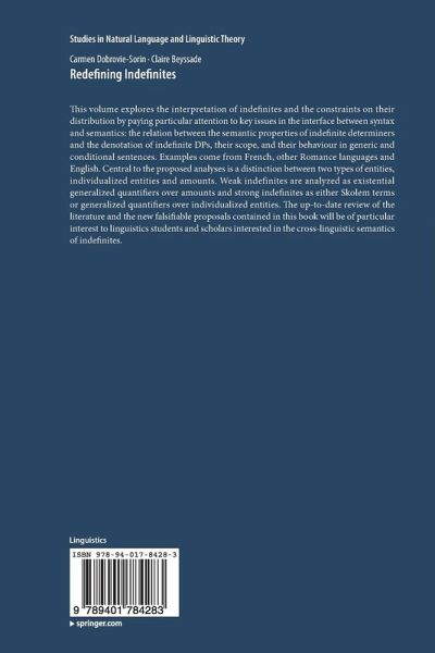 This volume explores the interpretation of indefinites and the constraints on their distribution by paying particular attention to key issues in the interface between syntax and semantics: the relation between the semantic properties of indefinite determiners and the denotation of indefinite DPs, their scope, and their behaviour in generic and conditional sentences. Examples come from French, other Romance languages and English. Central to the proposed analyses is a distinction between two types of entities, individualized entities and amounts. Weak indefinites are analyzed as existential generalized quantifiers over amounts and strong indefinites as either Skolem terms or generalized quantifiers over individualized entities. The up-to-date review of the literature and the new falsifiable proposals contained in this book will be of particular interest to linguistics students and scholars interested in the cross-linguistic semantics of indefinites.