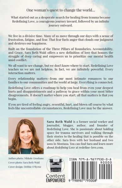 One woman's quest to change the world What started out as a desperate search for healing from trauma became Redefining Love, a courageous journey inward, followed by an infinite journey outward. We live in a divisive time. Many of us move through our days with a sense of frustration, fatigue, and fear. That fear fuels anger that clouds our judgment and destroys our happiness. Built on the foundation of the Three Pillars of Boundaries, Accountability, and Grace, Sara Beth Wald offers a new definition of love that honors the struggle of deep caring and empowers us to prioritize our mental health amid conflict. We all want to see change, but we don't know where to start. Redefining Love teaches us we are not helpless. In fact, we are infinitely powerful. Every interaction matters. Every relationship matters-from our most intimate romances to our families to our communities and the world at large. Everything is connected. Redefining Love offers a roadmap to help you heal from even your deepest hurts and disappointments and a pathway to grace within your most bitter disagreements. It doesn't matter where you start; all that matters is that you begin. If you are tired of feeling angry, resentful, hurt, and blown off course by what feels like uncontrollable circumstances, Redefining Love may be the answer.